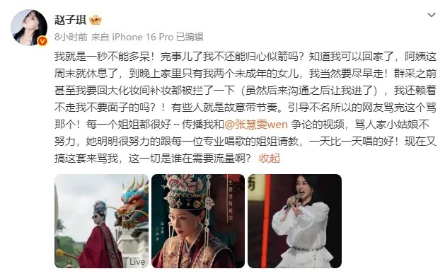 12日,赵子琪在社交平台上发文回应和张慧雯争论视频,她表示:“每一个姐姐都很好~传播我和张慧雯争论的视频,骂人家小姑娘不努力,她明明很努力的跟每一位专业唱歌的姐姐请教,一天比一天唱的好!现在又搞这套来骂我,这一切是谁在需要流量啊?”